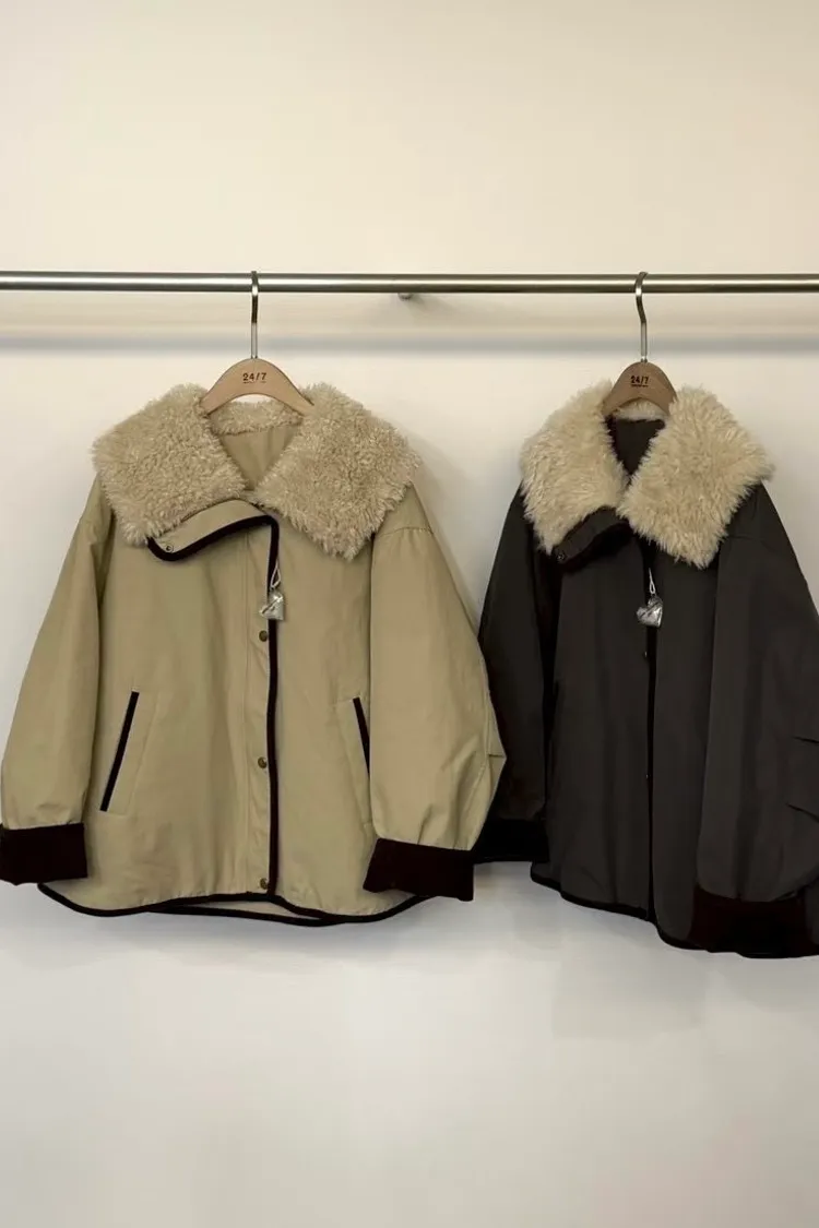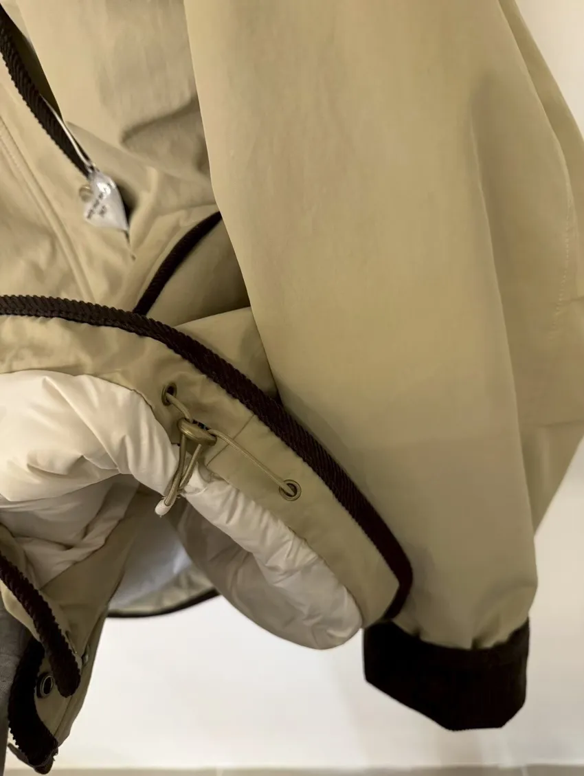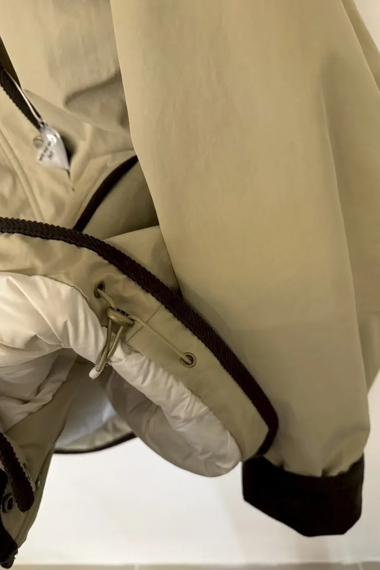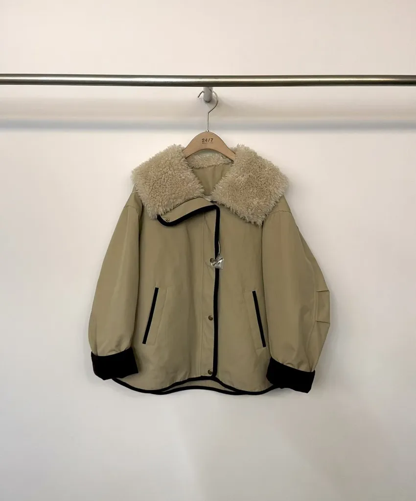 UQ25拼接毛毛翻領鴨絨外套(杏,墨)