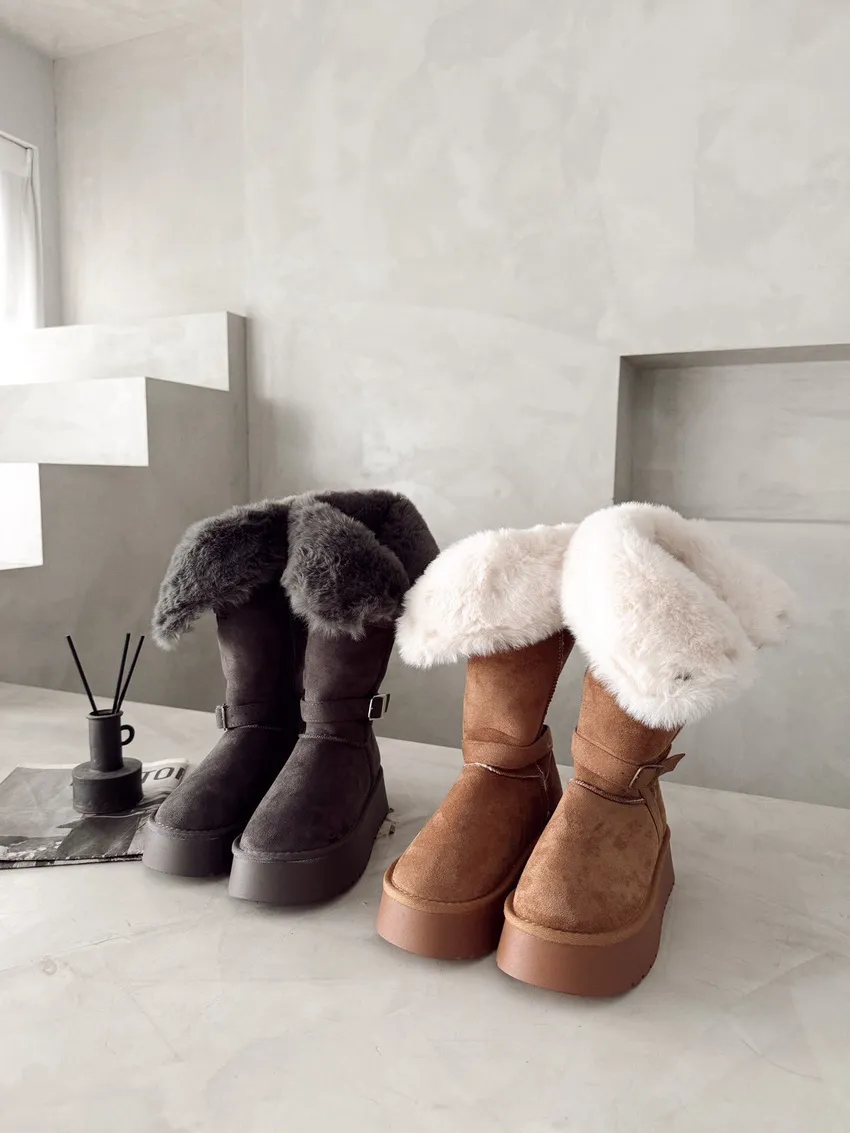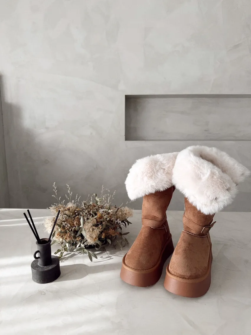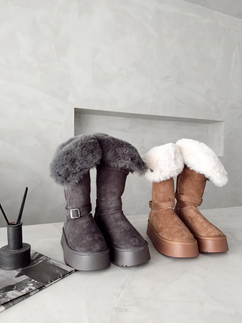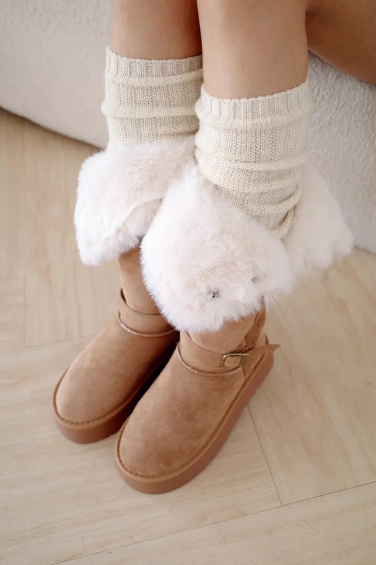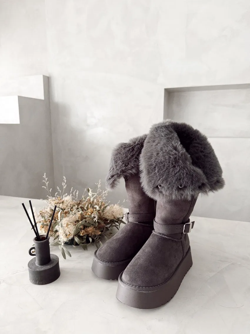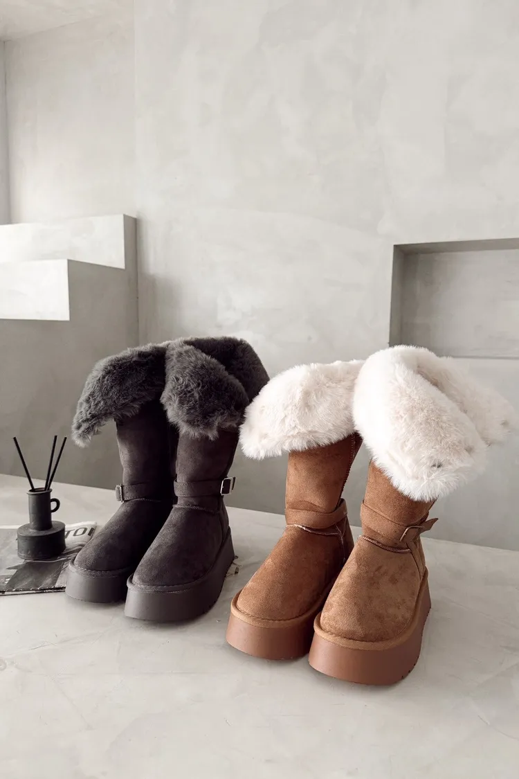 UQ39反折毛毛長筒雪靴(杏,灰)