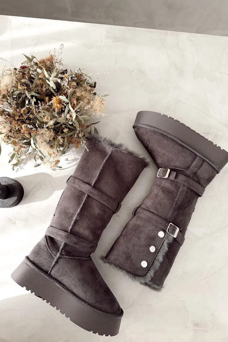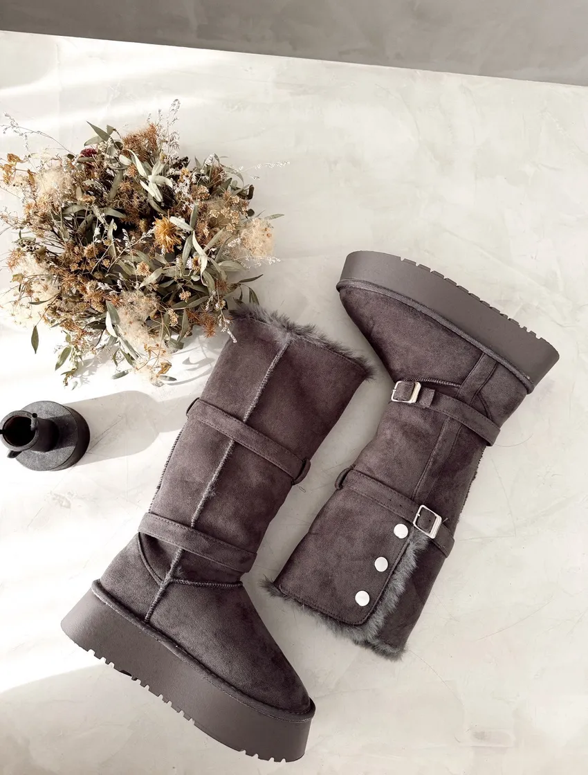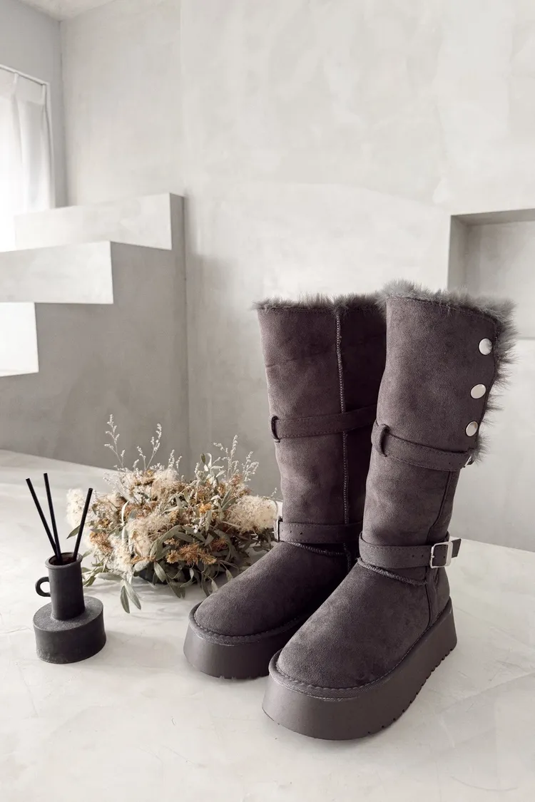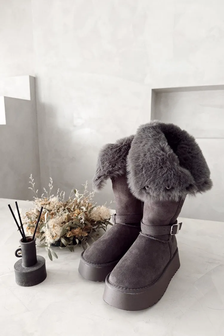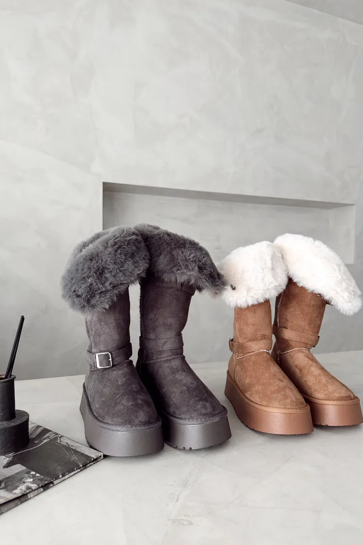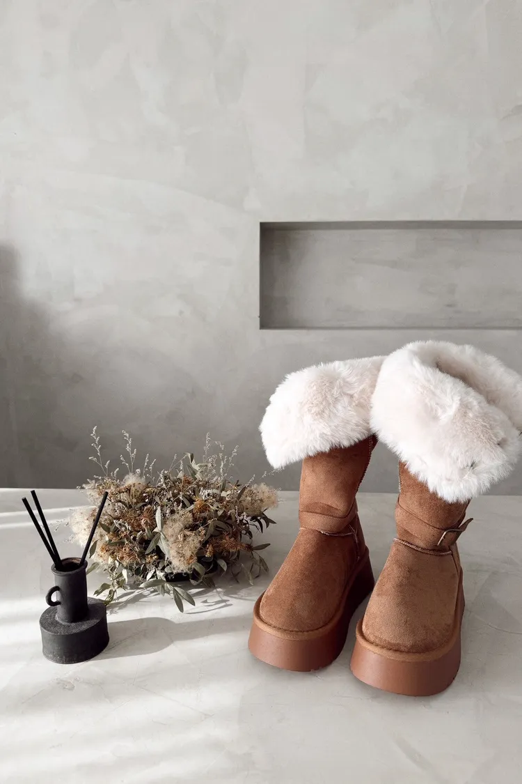 UQ39反折毛毛長筒雪靴(杏,灰)