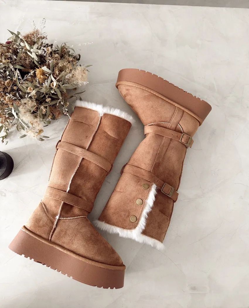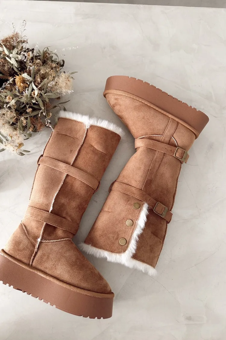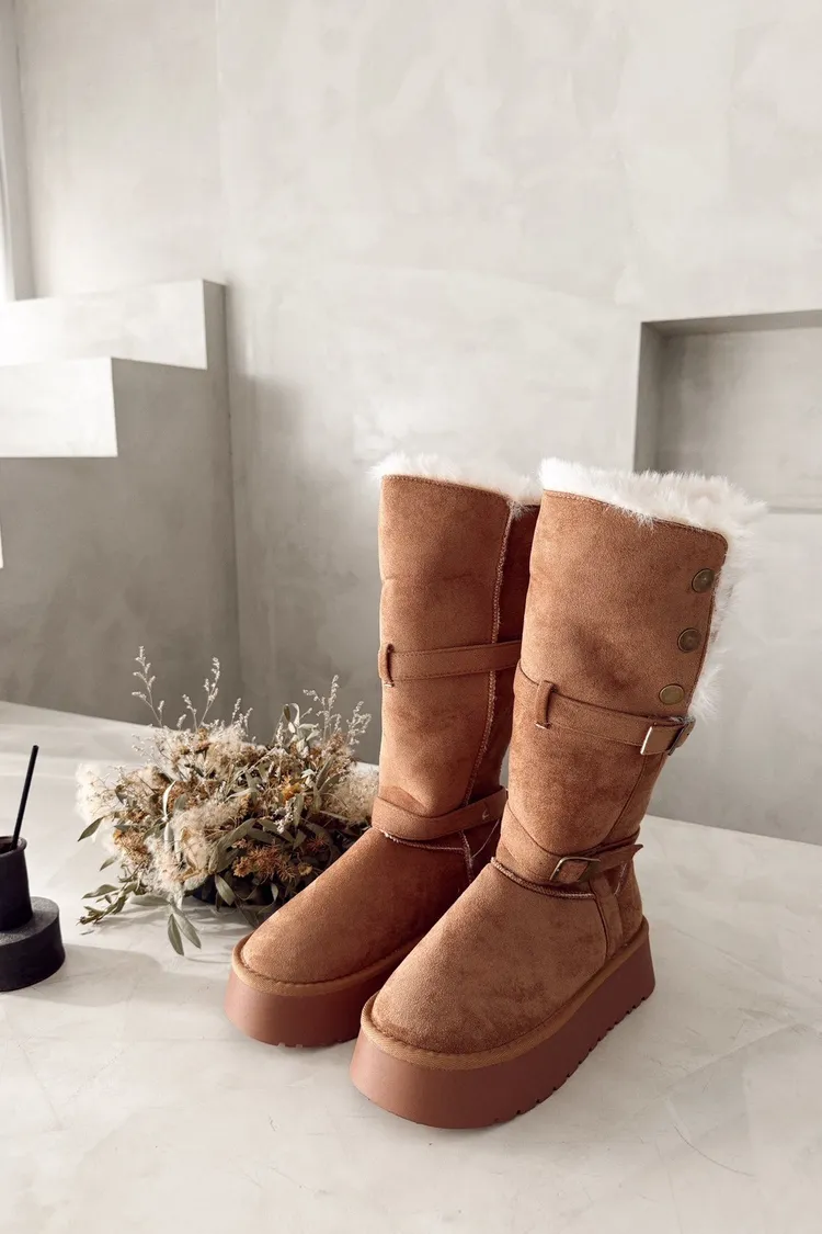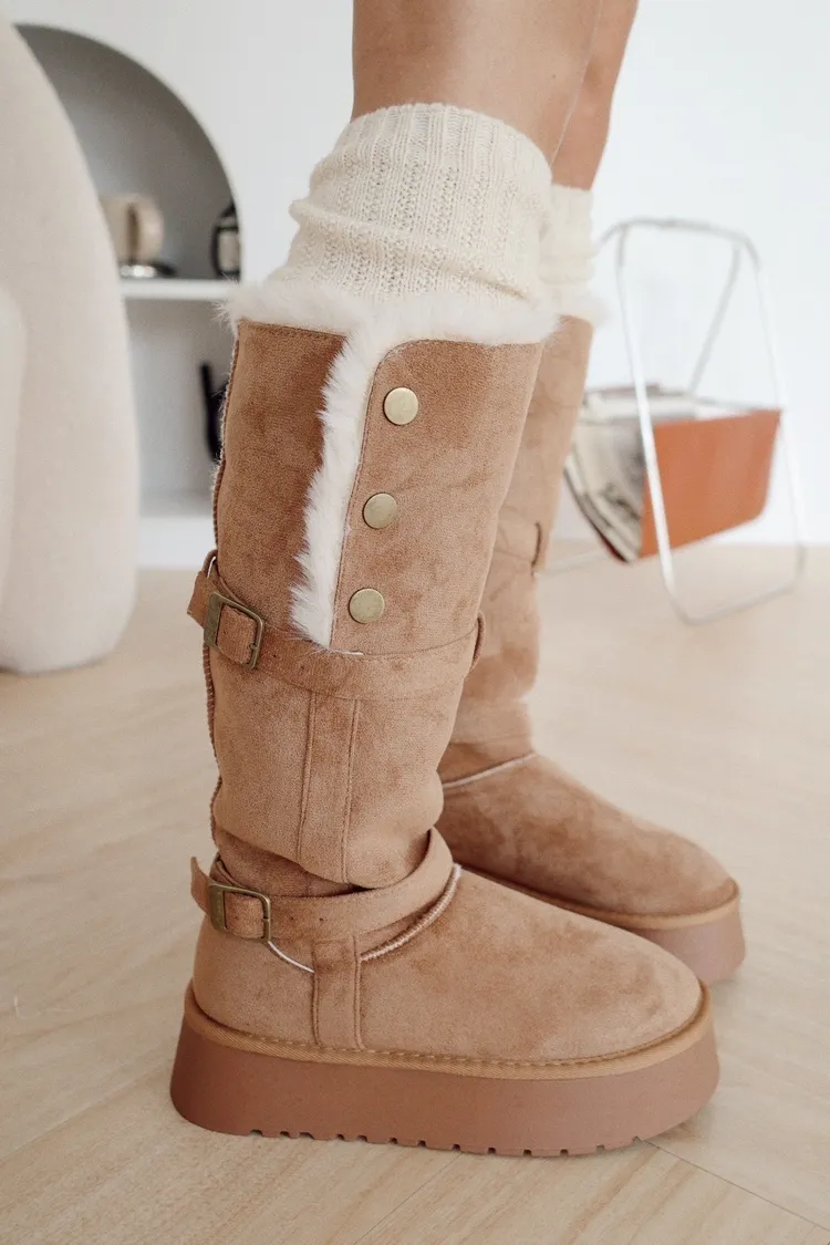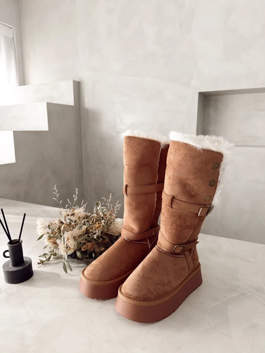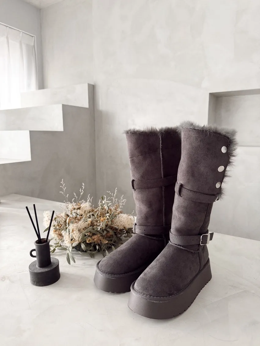 UQ39反折毛毛長筒雪靴(杏,灰)