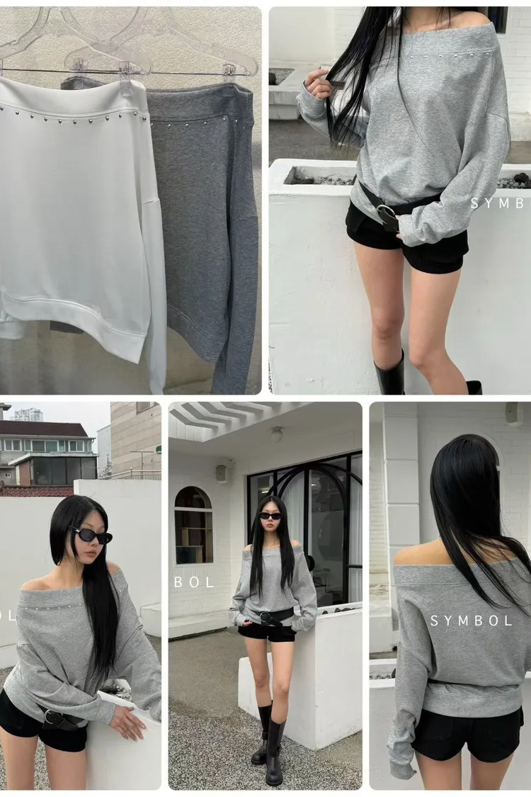 UR16鉚釘一字領上衣(白,灰)