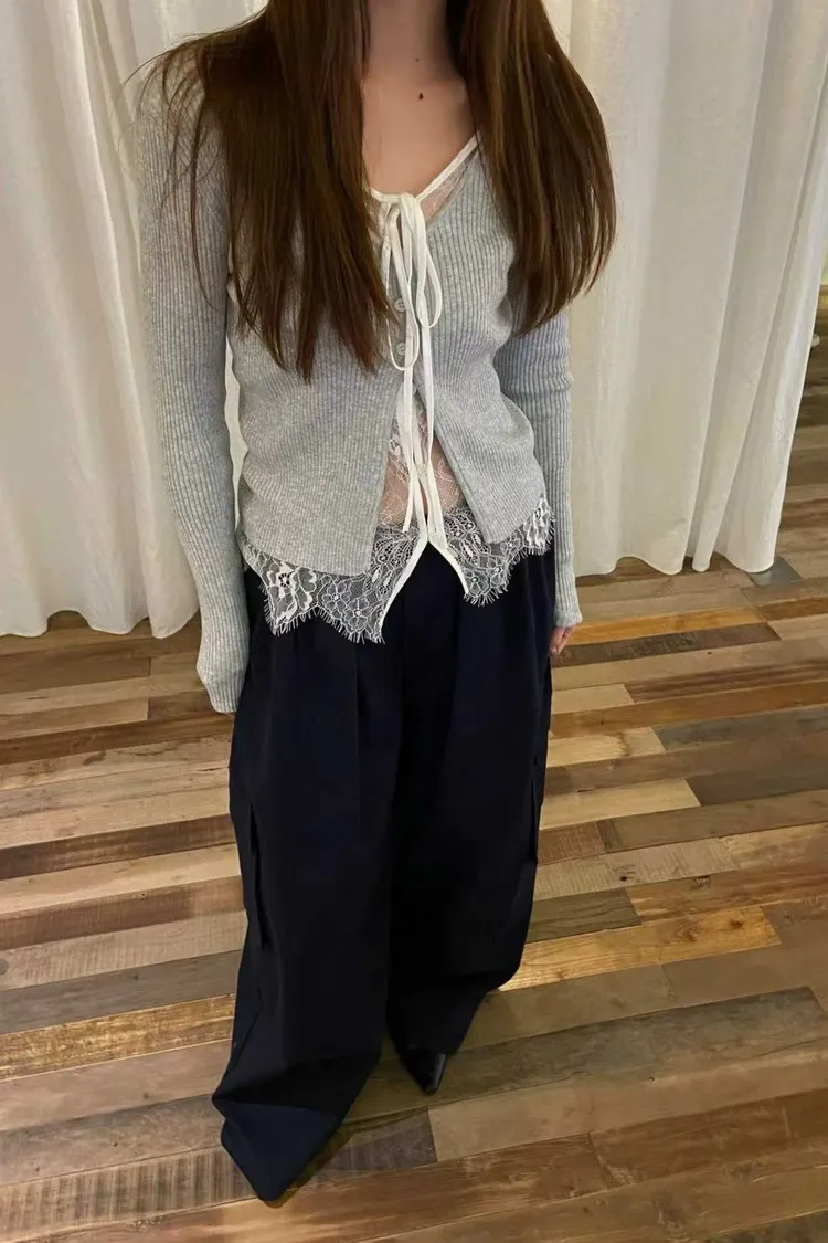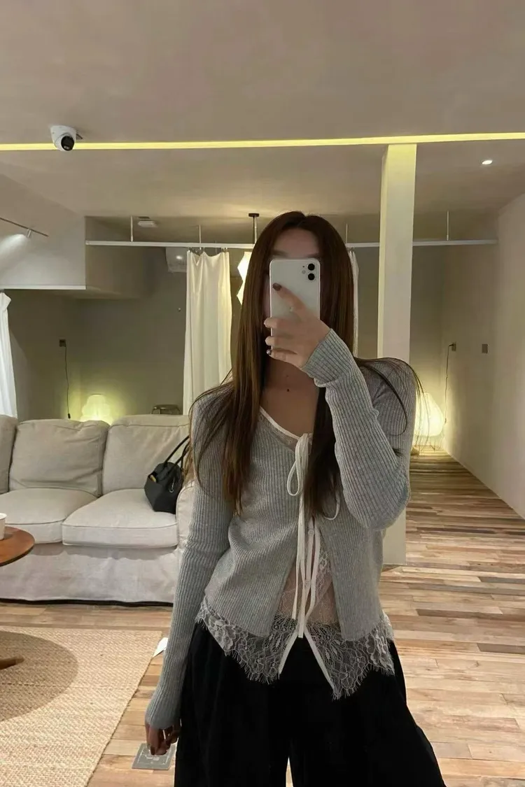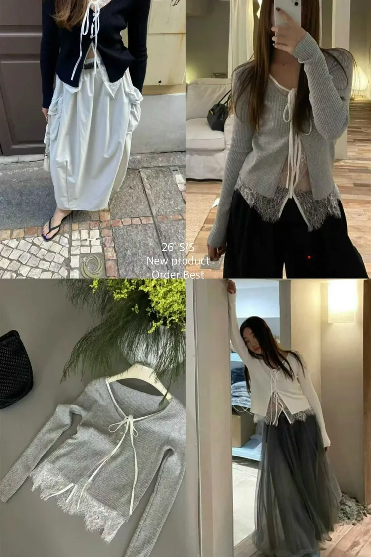 UR35綁帶假兩件蕾絲針織衣(白,灰,黑)